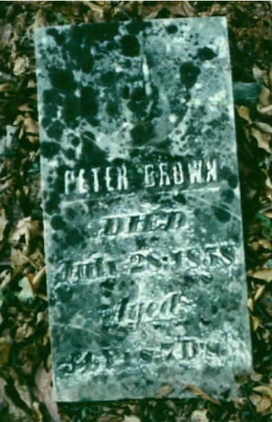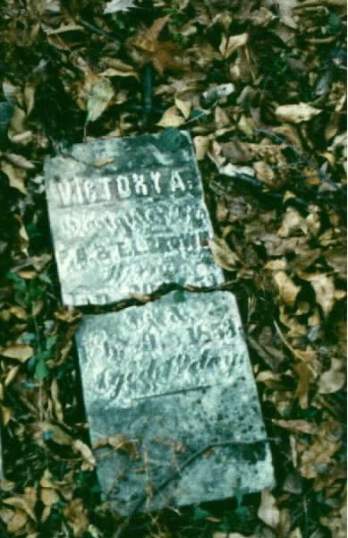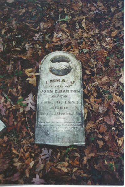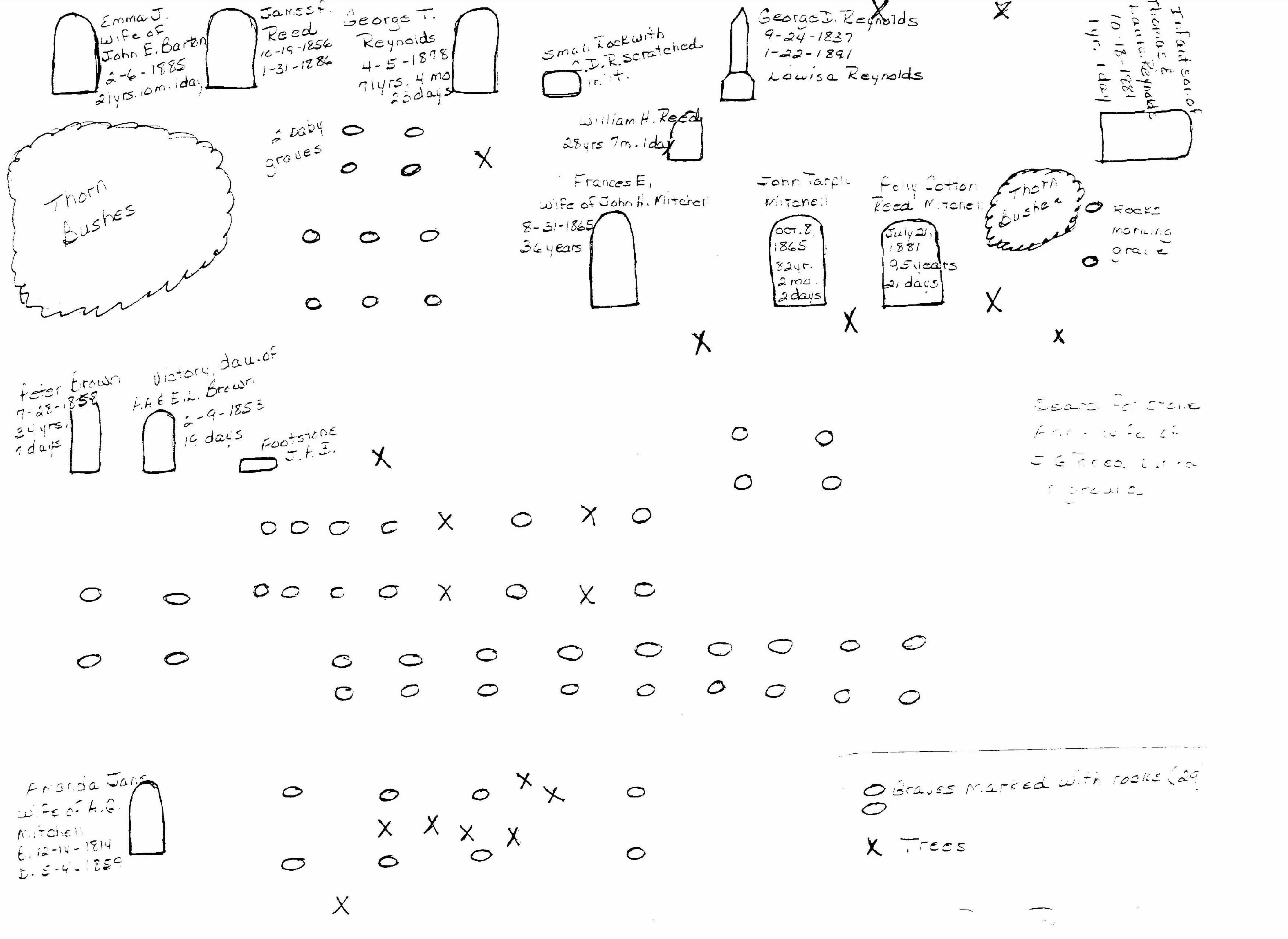 CEMETERY LAYOUT 1. BARTON, Emma J. (nee Reed), wife of John E. Barton -- d. February 6, 1885 age 21 years, 10 months and 1 day. 'Weep not for me my husband, nor mourn the change that death has wrought, my soul is now in a happy sphere, where my body is laid' 2. BROWN, Peter -- died July 28, 1858, age 34 years, 7 days. 3. BROWN, Victory A. -- daughter of Peter & Ellen Mitchell Brown, died February 9, 1853, age 19 days. 4. MITCHELL, Amanda Jane, (nee Davis) --
